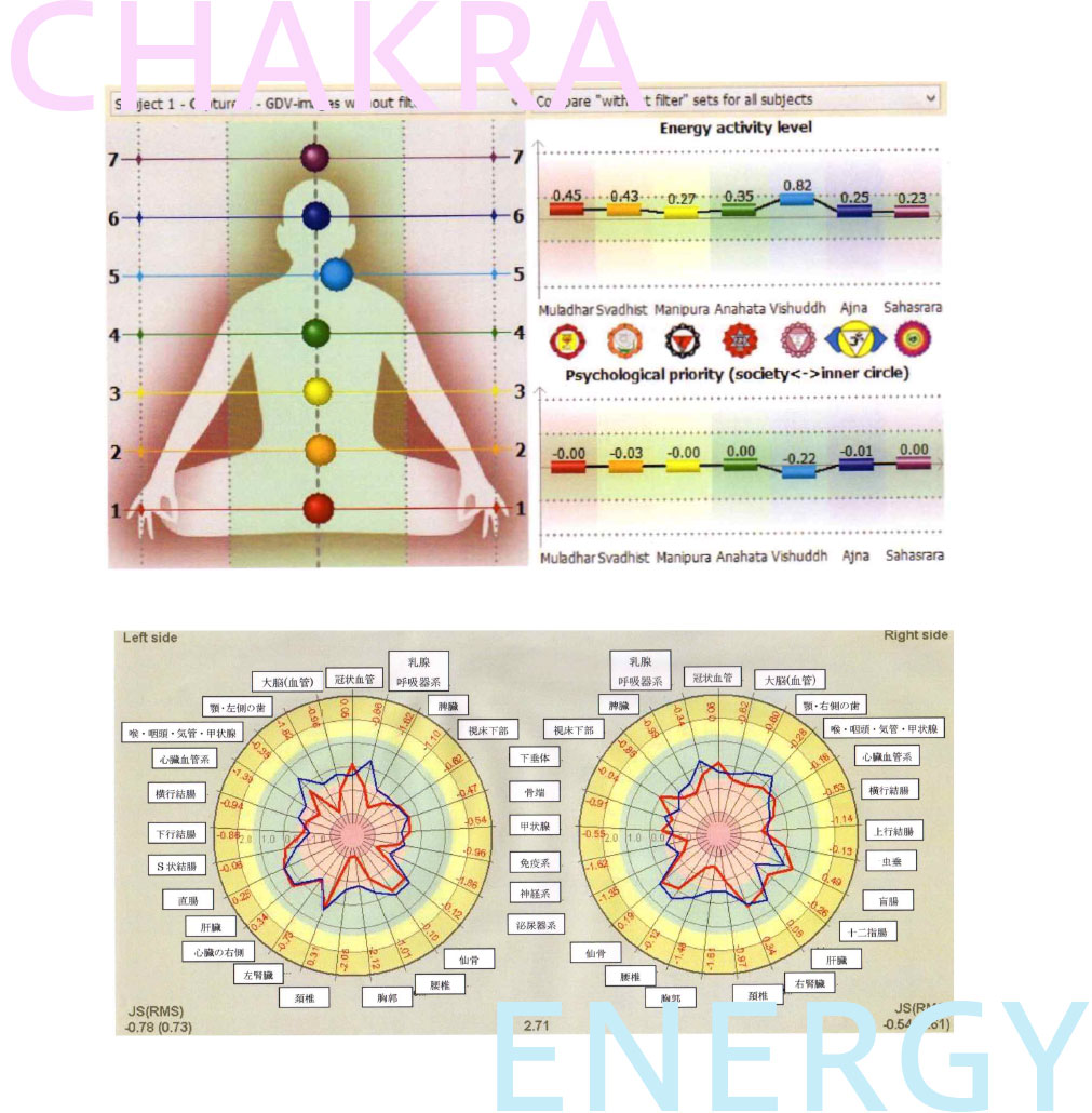 チャクラのバランスとエネルギー量がわかります。チャクラは心身のつなぎ目の位置にあり、双方の状態を反映しています。チャクラが右に偏っているものは、身体や外的要素優位に働き、左に偏っているものは精神や内的要素優位に働いていることを表します。